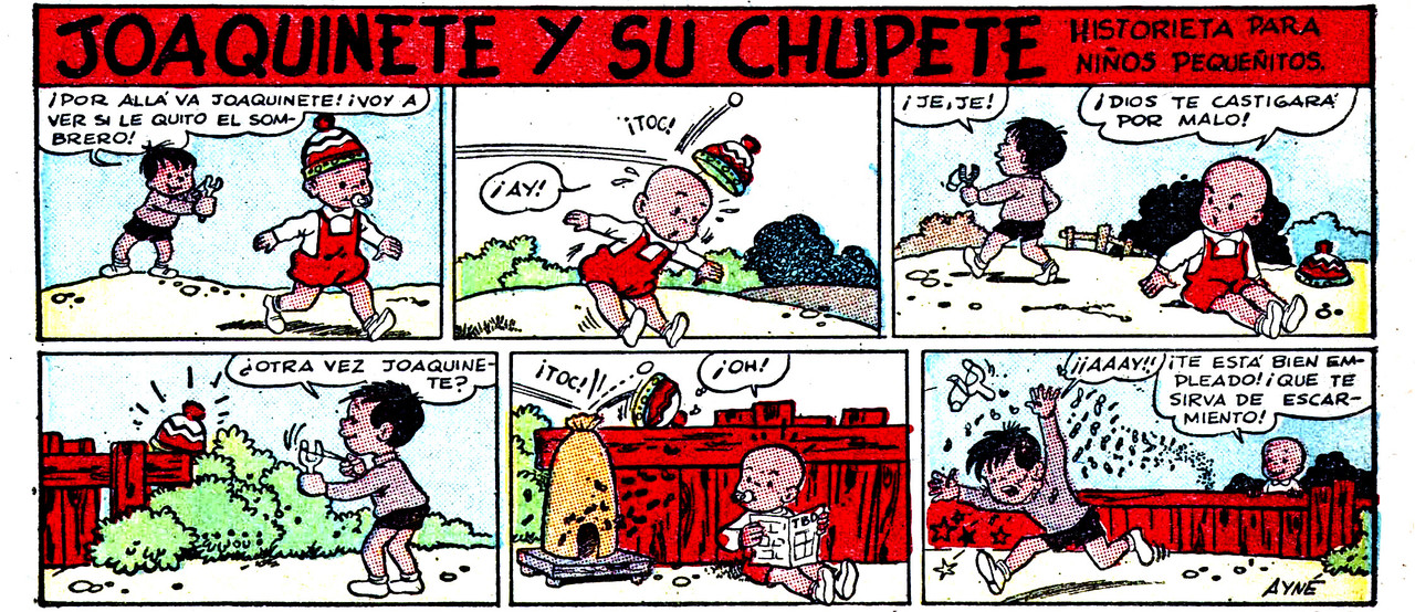 JOAQUINETE Y SU CHUPETE, de Antoni Ayné Esbert, hijo del escultor Jacint Ayné. Antoni Ayné se dedicó a la litografía y desde muy joven ya publicaba profesionalmente en varios semanarios infantiles, aunque su presencia más continuada se dio en TBO, donde colaboró desde 1935 hasta su fallecimiento. Entre sus series destacan Los niños aventureros (cuadernos para la editorial Marco, 1946), El vampiro Draculín (Chispa, 1948), El Conejito Atómico (Yumbo, 1953) o Joaquinete y su chupete (TBO, 1966). Era primo del guionista y editor Antoni Ayné Arnau (?-1974), cofundador de la editorial Toray.