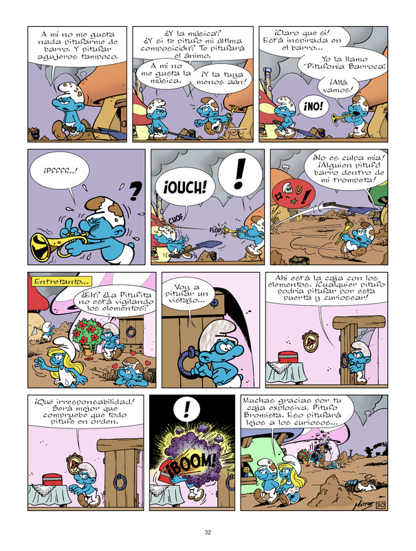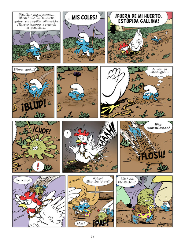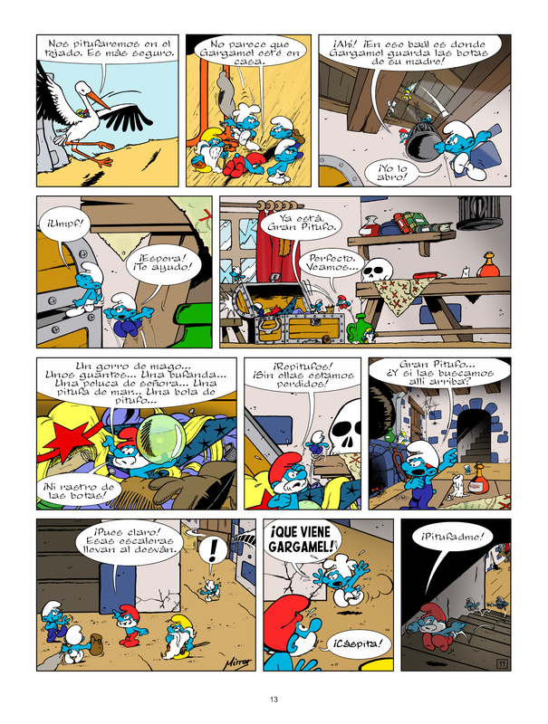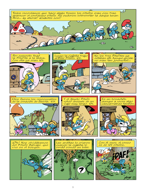 -La viñeta grande cuando se presenta al Abuelo Pitufo, con dos comentarios o referencias a "La Pitufita" y "El bebé pitufo".